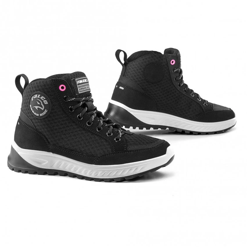 The Falco Airforce women’s ventilated motorcycle sneaker is ideal for the warmer summer days. The Air-Tech lining featuring superior performing characteristics and is structurally developed to be extremely breathable, anti-bacterial, quick drying and environment friendly. Sporty oil and petrol resistant anti-slip sole. Equipped with D3O ankle protectors and reinforcements on the nose for protection.[