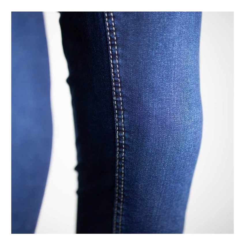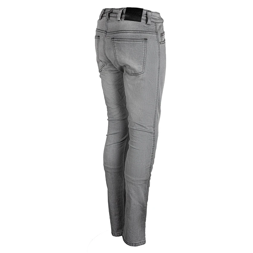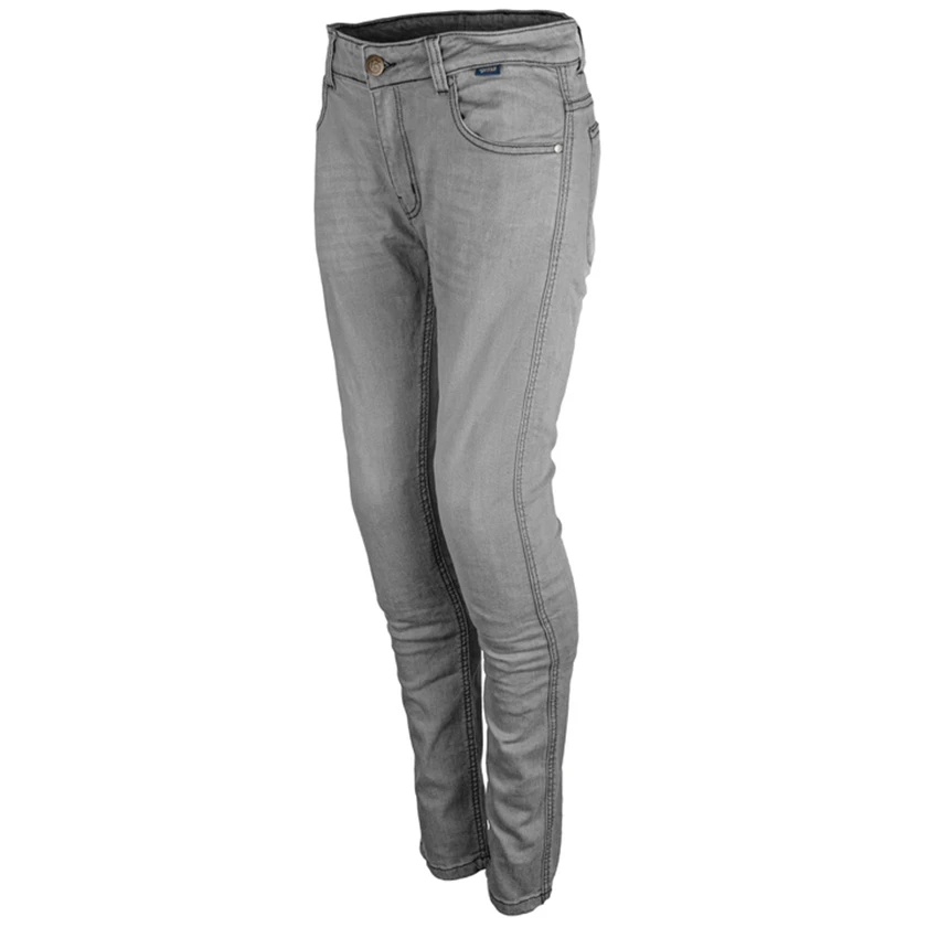 Germas Rattle women’s motorcycle jeans are made of a cotton outer shell with a Polyester lining. On the inside of these 2-layer pants you will find the protective Aramid fiber lining, applied to critical fall areas. The knees and hips are equipped with level 1 protectors. Classic 5-pocket jeans design and a slim fit fit.