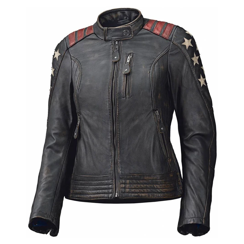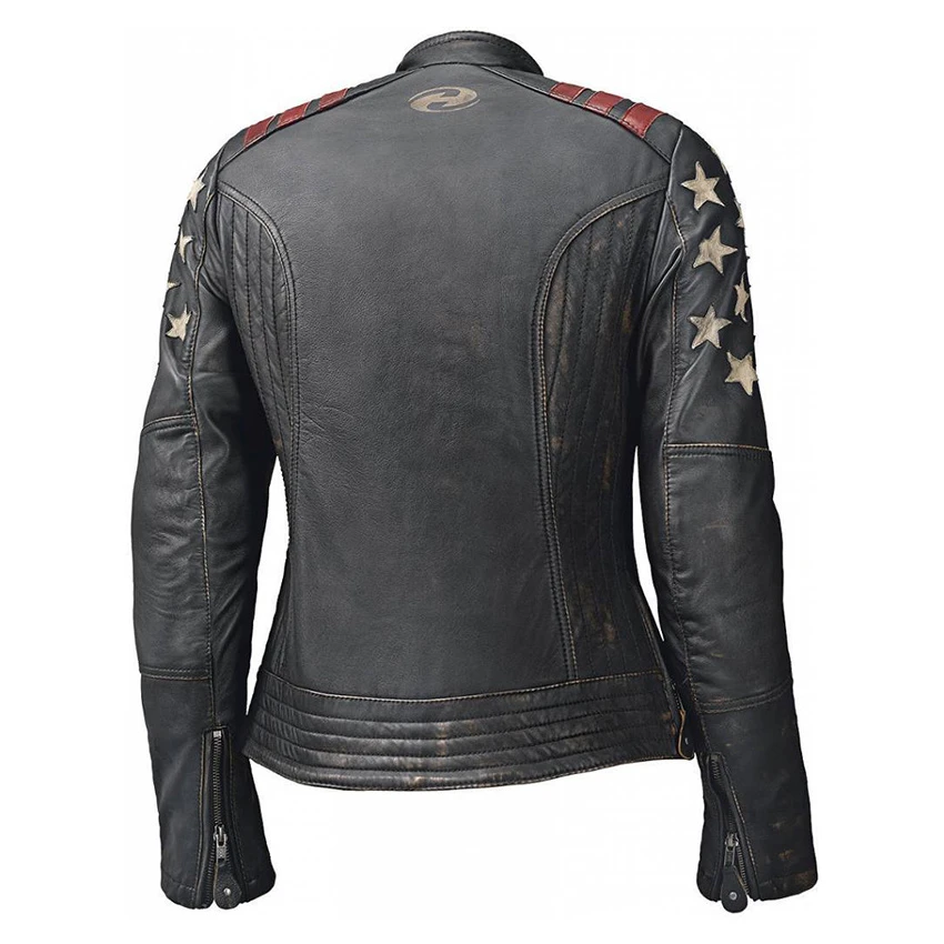 This great looking ladies jacket takes it inspiration from the stars and stripes. The soft cowhide leather and polyester inner lining offer you the comfort that a jacket should enhance.
