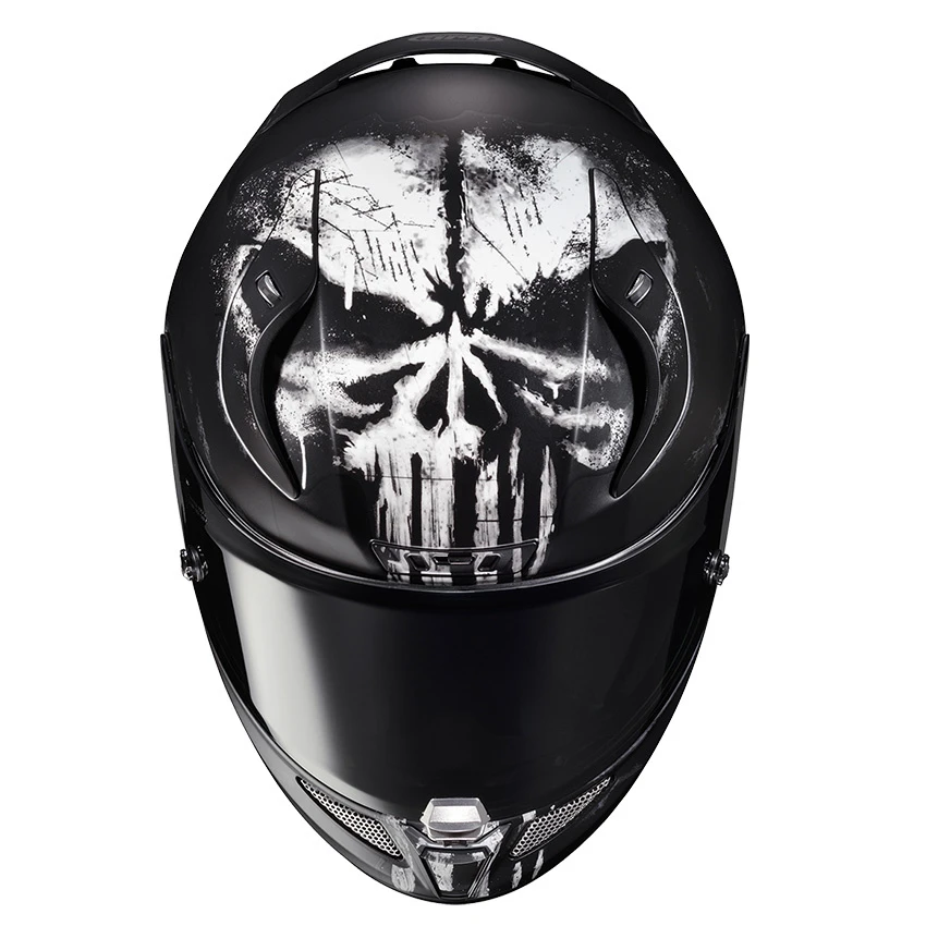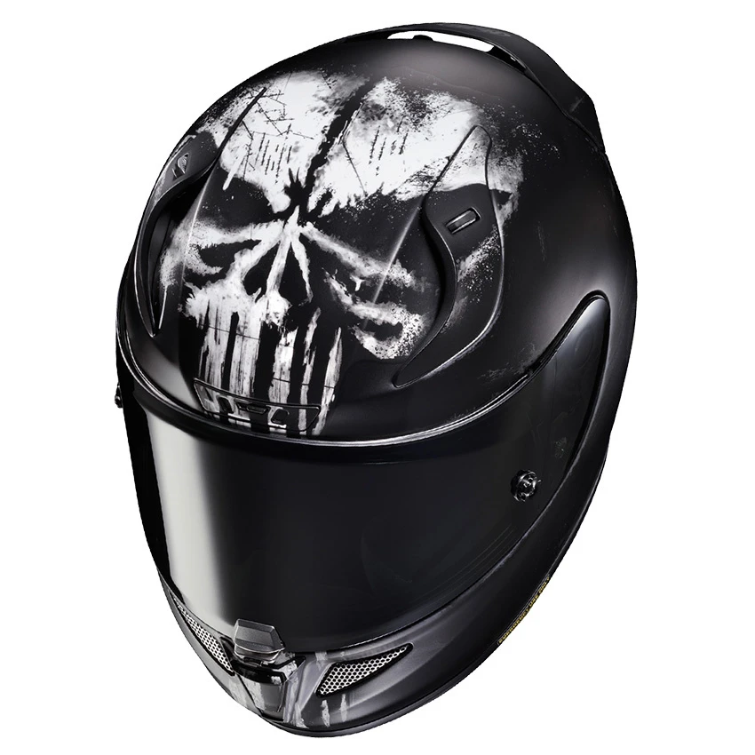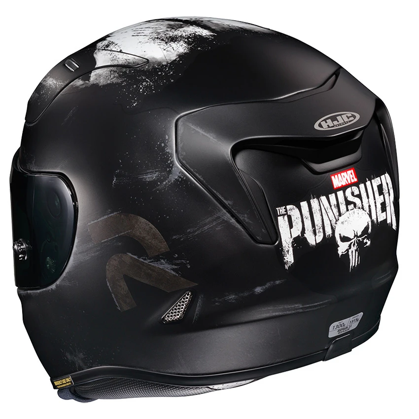Originally built for the racetrack, the RPHA 11 is HJC’s premium sport helmet, designed with an aerodynamic shell structure for extreme performance at maximum speeds. The Punisher graphic is part of the Marvel/HJC series. The Premium Integrated Matrix (P.I.M Plus) shell composition provides enhanced shock-resistant performance and a more comfortable and lightweight helmet using reinforcement materials that include carbon and carbon-glass hybrid fabric. The features cater to sport riders with an enlarged eye port for an increased view in a tucked position and an outstanding airflow ventilation system. Additional safety features include reflective patches on the rear neck area and an emergency release cheek pad system for safe and quick helmet removal in an emergency situation.