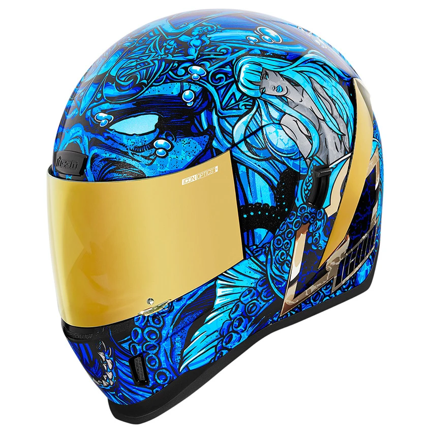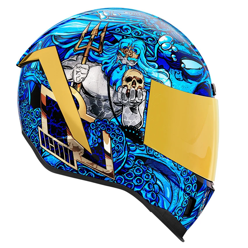 The Airformâ„¢ Ships’ Company pays tribute to this time-honored tradition with King Neptune and his consort Amphitrite. Rich gold foil, sharp tridents, and amorous tentacles beckon lonesome sailors to the pleasures of the deep. Streamlined and race inspired, the Icon Airform hits the street ready for speed. By sculpting the traditional neckline of the Airform it allows your head to slip in and out with ease. The helmet’s continuous chinbar venting system allows air to freely flow keeping you cool on those hot riding days. The Airform has not one, but two shields. The unique quick-change fog-free Optics shield keeps debris away while the internal interchangeable drop shield has the sun in check.Â