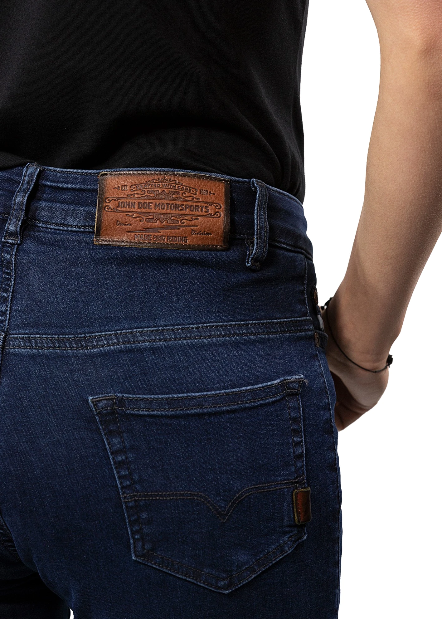 John Doe Betty High waist motorcycle jeans with XTM® fiber not only rock it in the looks department, the technical details give them full AA certification. This is mainly because of the XTM-Fiber® lining as well as knee and hip protectors for protection in any situation. Betty High Jeans XTM® come in a high-waist five-pocket design with outer fabric in stretch denim for supreme comfort.