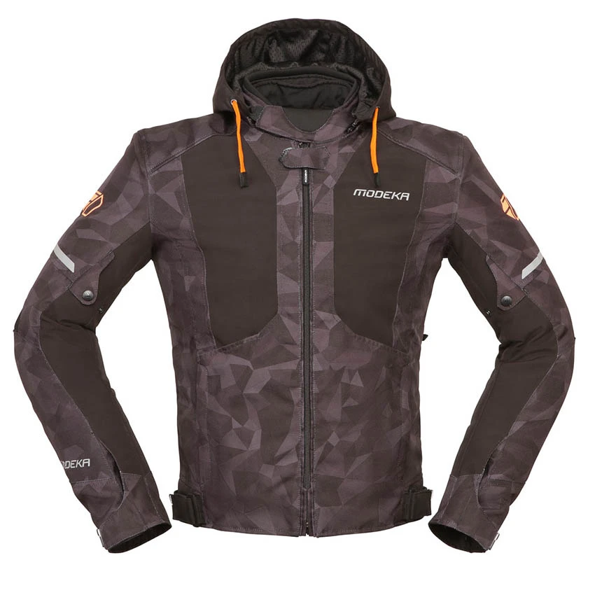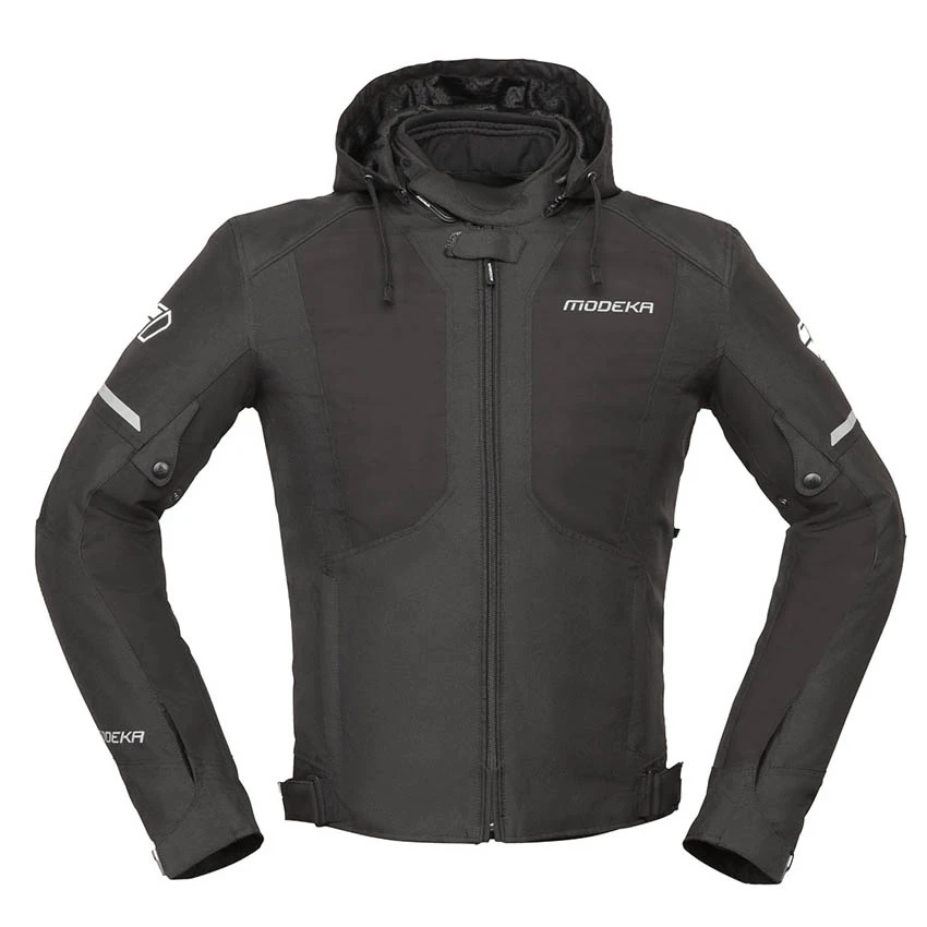 The Modeka Jakson motorbike jacket is made of abrasion-resistant 450D polyester and softshell outer fabric with stretch sections for enhanced comfort. For improved abrasion resistance, the Jakson jacket has dual material on crash zones. The removable Humax® membrane offers versatility and waterproof* performance in wet weather. Airvent ventilation zips offer cooling on warmer days. Standard equipped with protectors on the shoulders and elbows, the protection can be extended with an optional back protector. The Jakson has a long connection zipper all around and a short connection zipper at the back.