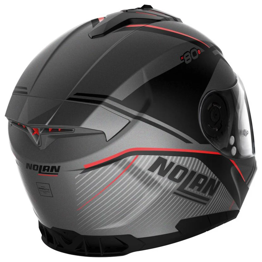 The N80-8 Astute is Nolan’s top of the range road full-face helmet the followup of the very popular N87. The modern design enhances every detail, from the shell to the air intakes. Thanks to its rich technical characteristics the N80-8 is the ideal helmet for any occasion. The large surface of the S/R (Scratch Resistant) visor makes it possible to have a broader view. The innovative visor mechanism with tilting functionality allows a greater extension of the area covered by the Pinlock® lens. Integrated sunvisor which can be easily removed for maintenance and cleaning and is fully-adjustable. Nolan’s AirBooster Technology for optimal ventilation keeps your head cool in any situation.
