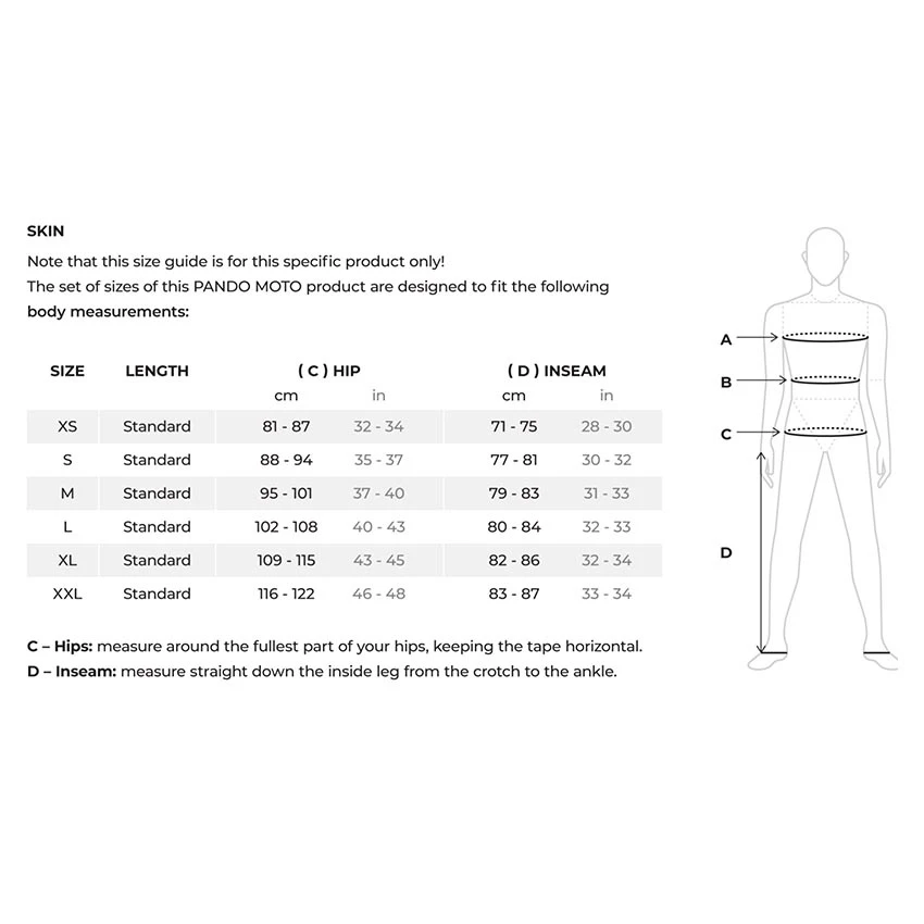 The Pando Moto Skin UH 03 bikers leggings are extremely durable made from power-stretch 65% UHMWPE and Spandex (15 times stronger than steel) fabrics. This unisex legging is highly abrasion-resistant and extra heat conductive. Due to the comfortable tight cut – these leggings fit like a second skin, the protectors are secured in place and doesn’t move around. It is specially designed to be worn under your regular garments for an extra layer of impact protection. Pando Moto has also added a double mesh for extra ventilation and breathability. The Skin UH 03 is delivered with knee and hip protectors included, the legging is fully CE approved level AA.Â