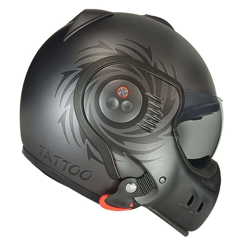 Roof RO5 Boxer V8 S Tattoo offers an optimised Boxer V8 version: new lip seal for an increased sealing, fully removable, washable and adjustable new Silent Lining comfort, new antibacterial and quick drying fabric and a new micrometric chinstrap buckle.