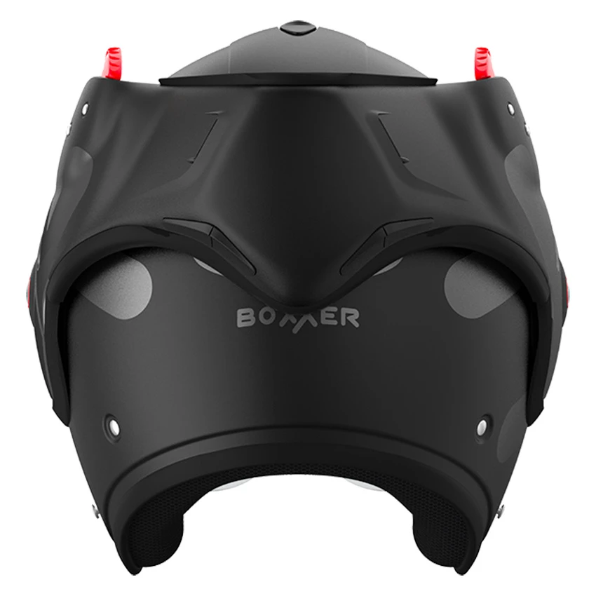 2 extra release buttons ensure quick opening of the chin guard in case of emergency. The addition of a reversible stop for a soft and controlled locking of the chin and the inner foam is provided with a recess for glasses wearers.