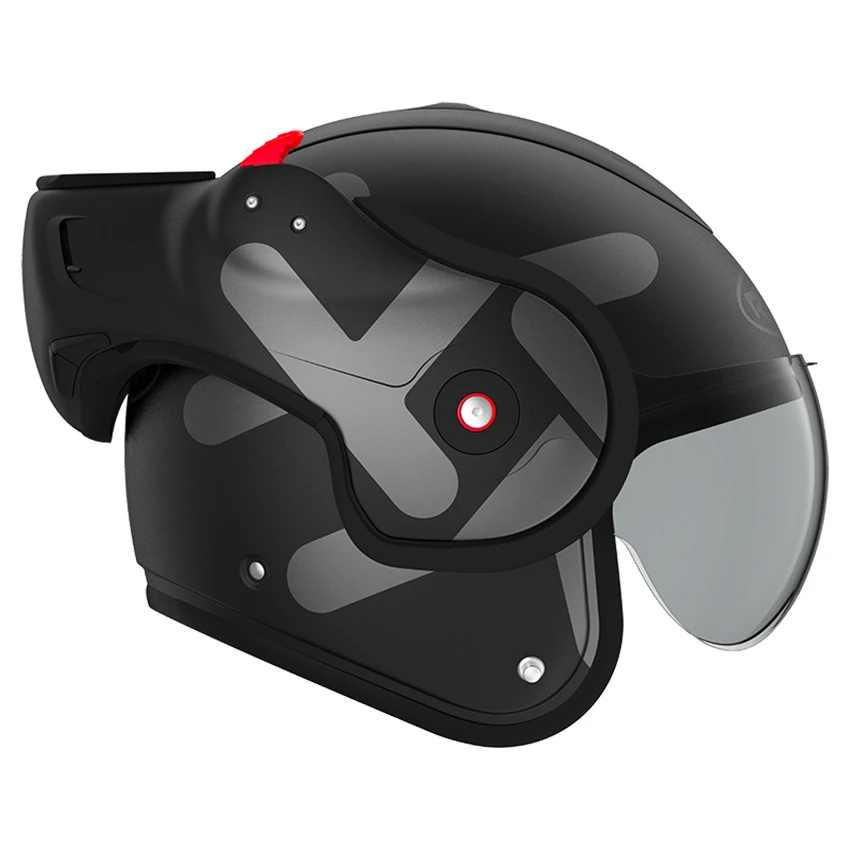 The helmet retains its double inspection of jet and system helmet but also gets the ‘silent lining’ as we know it from the Roof Desmo. In addition, you lock and unlock the chin with one hand!