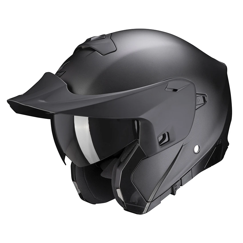 The helmet is made of polycarbonate which provides good impact protection, but is also lightweight. Thanks to the adjustable ventilation openings at the front and back, the helmet stays comfortable and cool on hot days. The KwikWick II liner is soft, comfortable and quickly wicks away moisture. The inner lining is also removable so that you can wash it.The Scorpion EXO-930 comes with an integrated sun visor which you can easily operate, even with gloves on. .