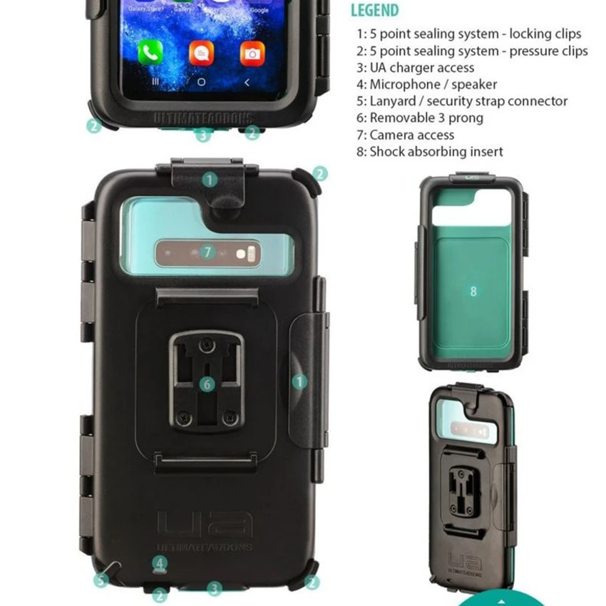 The UltimateAddons Universal XL waterproof smartphone/GPS Tough Case. Plastic IPX5 splash-proof case is equipped with a 3-point connection so that, for example, it can be attached to an Ultimate addons ball head or RAM Mounts Motor attachments with 25 mm B-balls in combination with the optional 3-point B-ball connector. A very nice low-profile mounting on motorcycle or bicycle because the case can be mounted directly on the B-ball without an adapter! The case comes with a lanyard to hang securely around your neck when not in use.